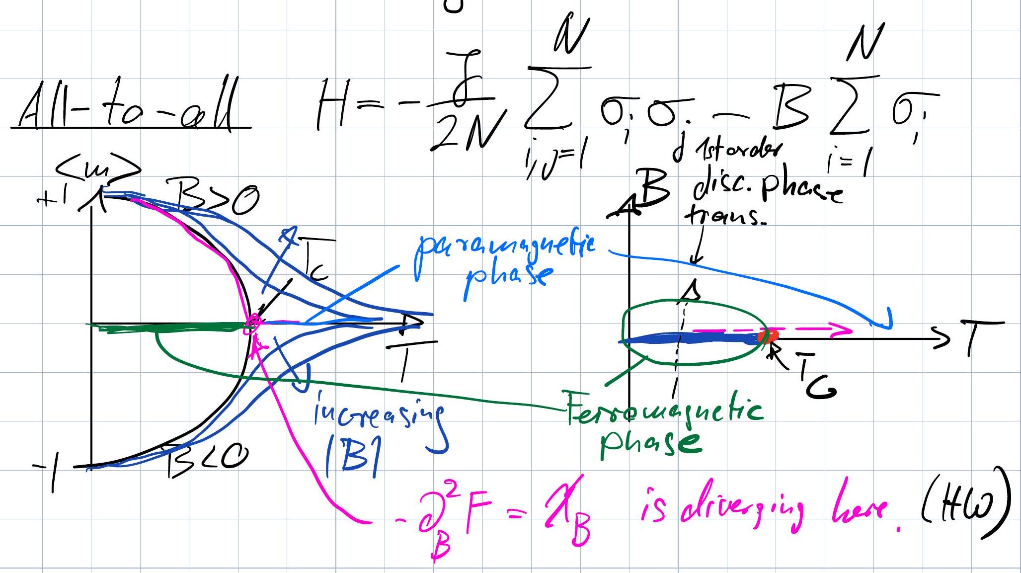Also, \(F(T, B)\) is an analytic function without any cusps, kinks or singularities. Since observables are obtained from derivatives, eg. \(\left\langle\sigma_{i}\right\rangle=\frac{1}{N} \partial_B F\), everything behaves smoothly: no phase transitions.