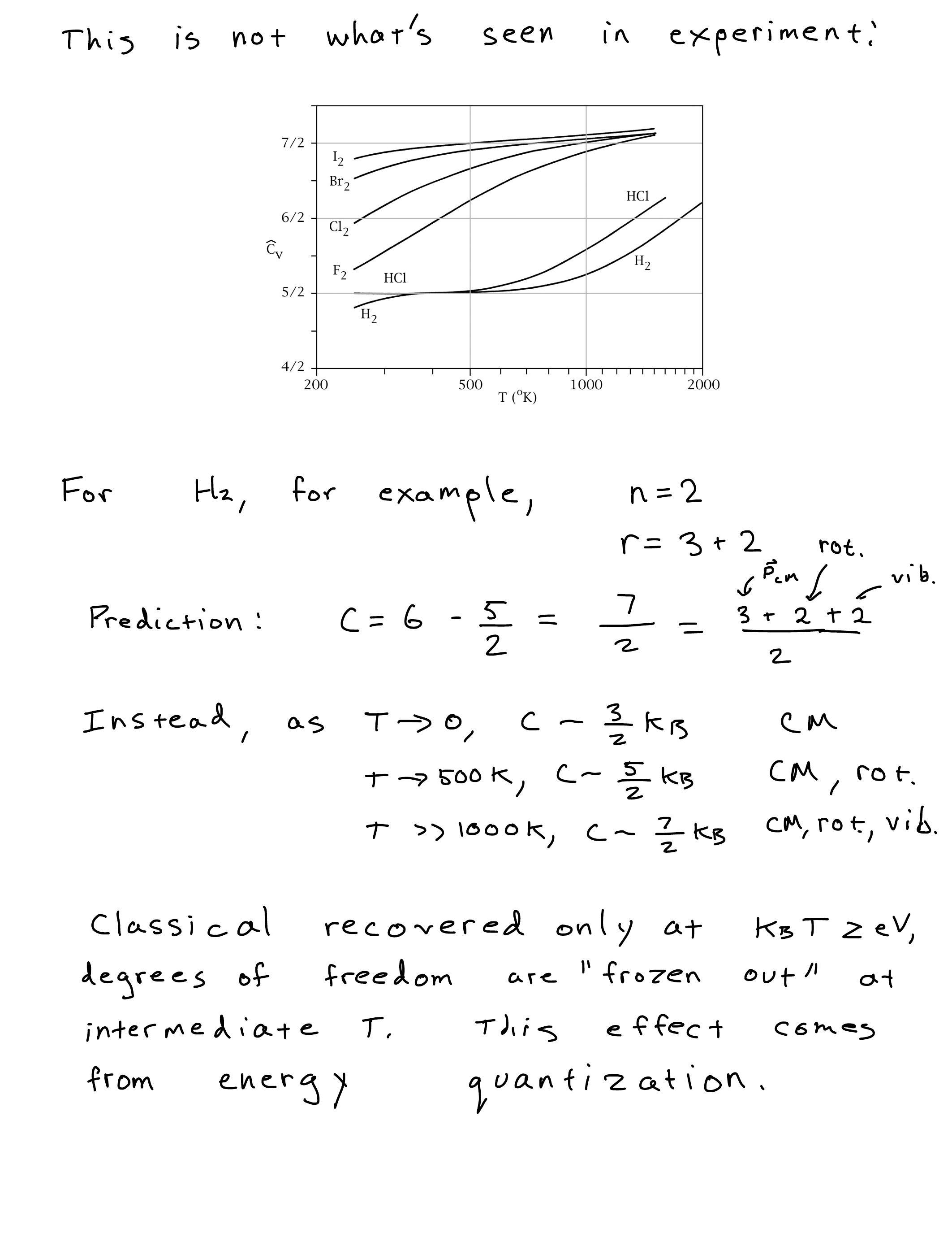 However, this is not what is observed in experiments: at low temperatures, many degrees of freedom are “frozen out” due to energy quantization, and \(C_v\) increases stepwise with temperature as different modes become accessible.