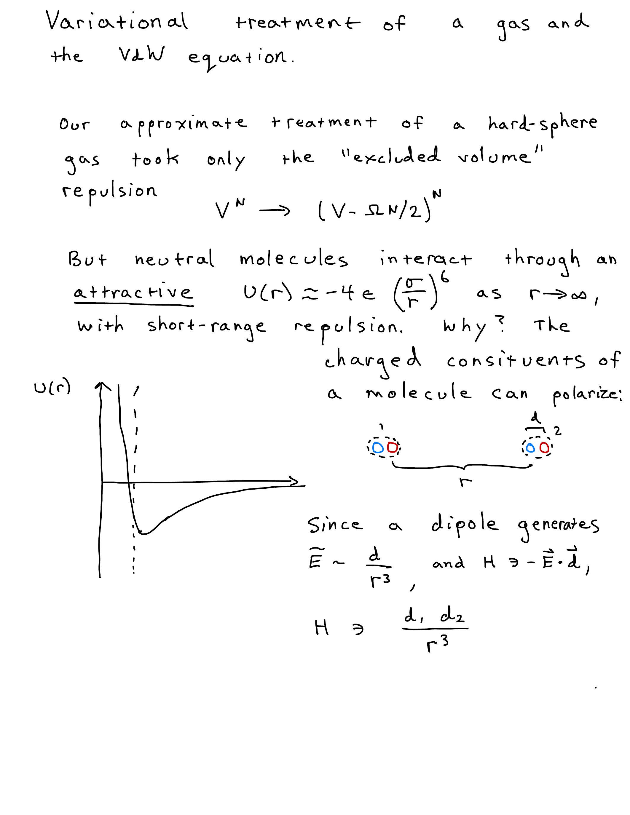 But neutral molecules interact through an attractive \(U(r) \approx-4 \epsilon\left(\frac{\sigma}{r}\right)^{6}\) as \(r \rightarrow \infty\), with short-range repulsion. Why? The charged constituents of a molecule can polarize: