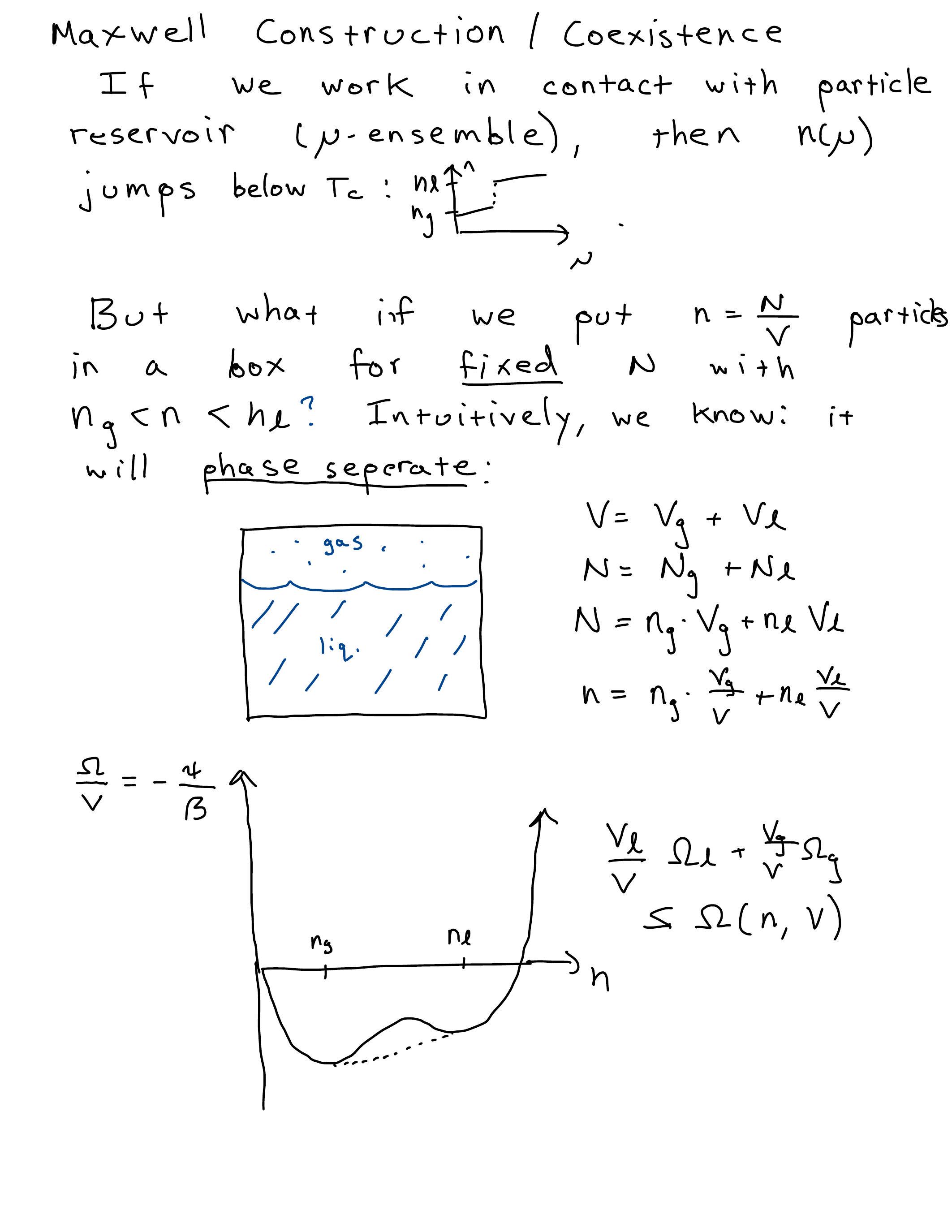 But what if we put \(n=\frac{N}{V}\) particles in a box for fixed \(N\) with \(n_{g}<n<n_{l}\) ? Intuitively, we know: it will phase separate: